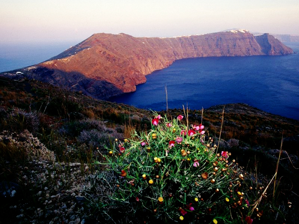 The route is about 2.5 km, and takes to complete from 40 minutes to an hour and a half depending on the stops that are made to rest and take photos. It is important to wear sunglasses, hat, sneakers, sunscreen and water. The path to Ancient Thira is an old road, which takes the traveler on the slopes of Profitis Elias and Vouno Mesa. After starting, after a few minutes walking you will meet the path to Katefiani small church on your right that you can have a sort visit for a few photos. Just before arriving at the top you will find the area where the cremation burials were found in the archaic period. Once you are at the top take a right to get to the entrance of the archaeological site. DON’T FORGET THAT ON MONDAYS IS CLOSE.